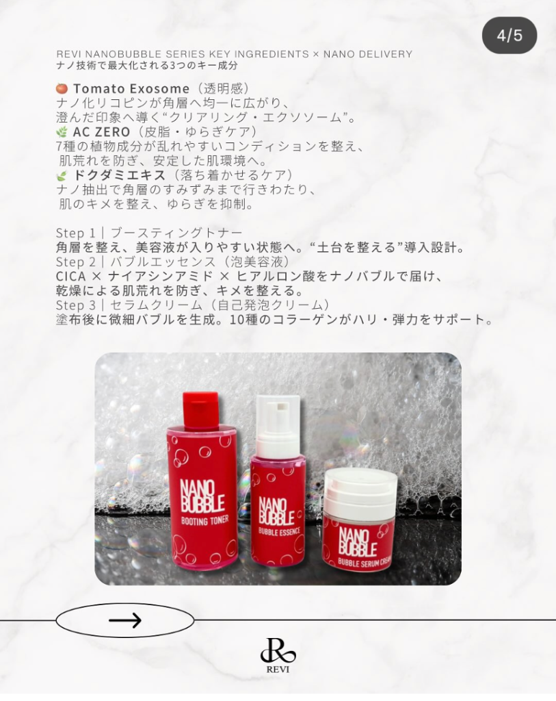 待望のREVI新施術✨肌を育て磨き上げる✨第5世代ピーリング✨【陶肌ピール】特徴→敏感肌の方でも安心して受けていただける、低刺激処方かつノーダウンタイム施術。肌へのやさしさと圧倒的な結果を両立させた秘密は、贅沢に配合された成分にあります。成分→LHA(リポヒドロキシ酸):角質をやさしく柔らかくし、有効成分を深部へ届けます。AHA / PHA:古い角質を穏やかに除去し、ターンオーバーを正常化します。トマト由来エクソソーム:メラニン生成を抑え、透明感をサポートします。タマヌオイル:高い抗炎症・抗酸化・保湿力で施術後の肌を守ります。さらに、独自のナノバブル抽出法により、毛穴の奥のすみずみまで成分が行き渡り、しっかりと汚れを分解しながら炎症やくすみにも直接アプローチ。施術直後から、なめらかでツヤのある素肌をご実感いただけます。【施術周期について】 ※陶肌トリートメントと併用していただく場合は、陶肌トリートメント施術の4日後に陶肌ピール®の施術が可能です