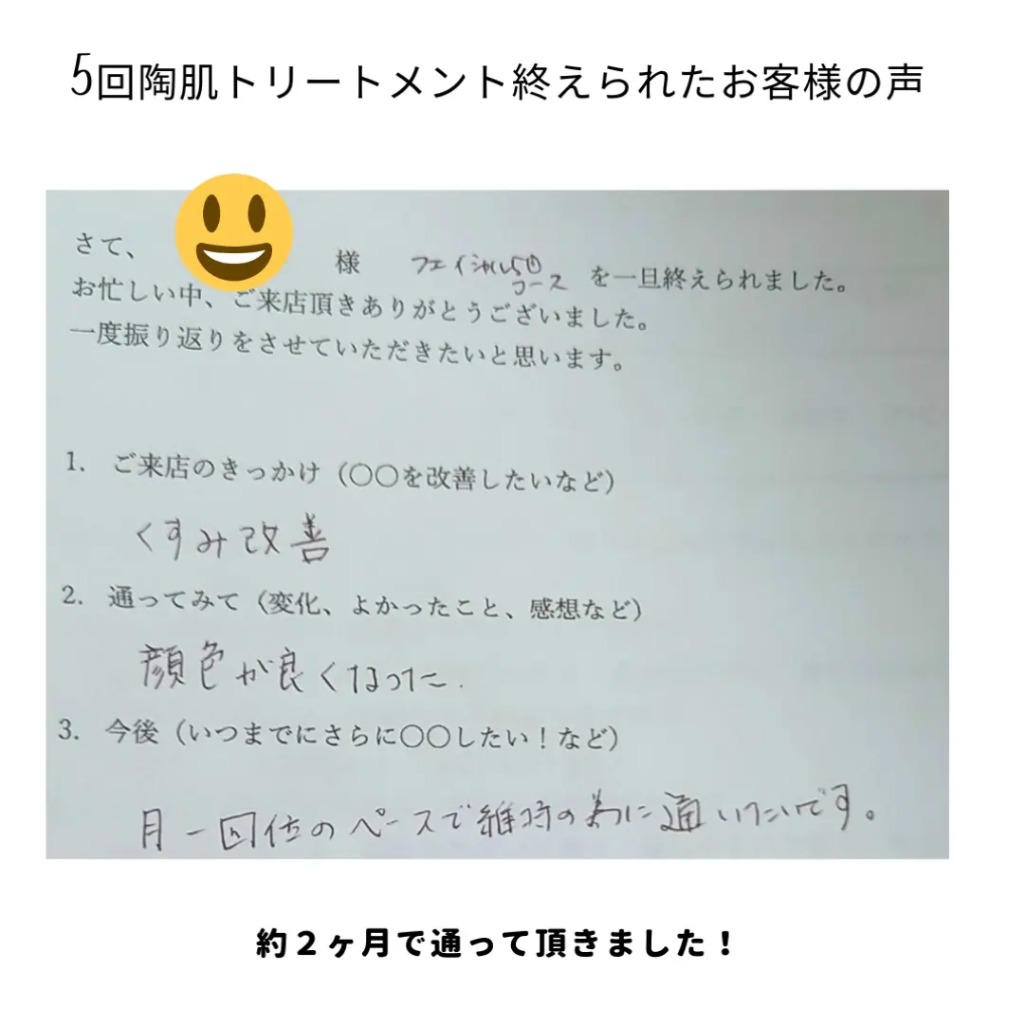 くすみがとれて、お肌トーンアップして、お客様自身も毎回フェイスラインのスッキリ感がすごい!と😄