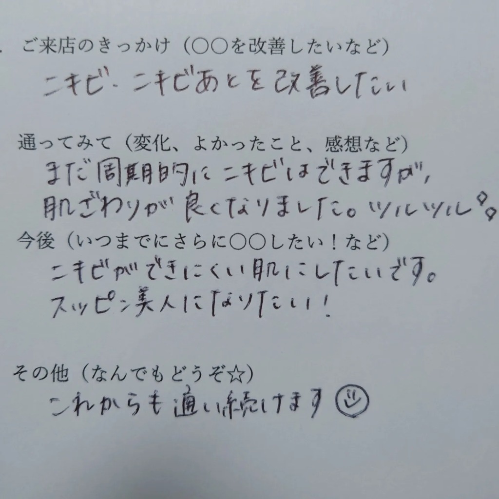 10代のころから色々な化粧品やエステ、皮膚科に行ったりとニキビにずっと悩まれていたお客様