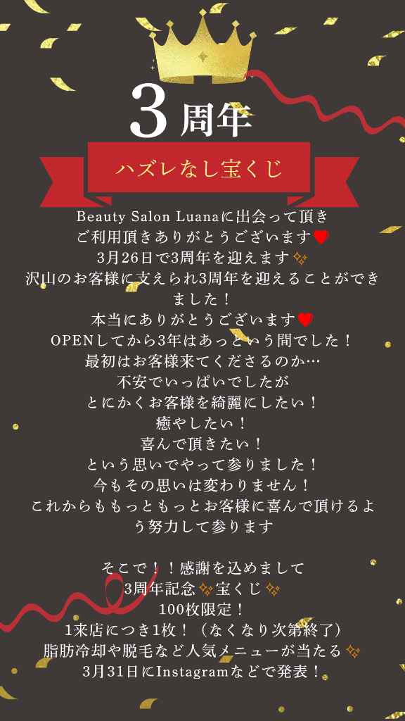 当店人気メニューのマイラミネーション、脂肪冷却、脱毛などが当たるチャンス✨✨😆